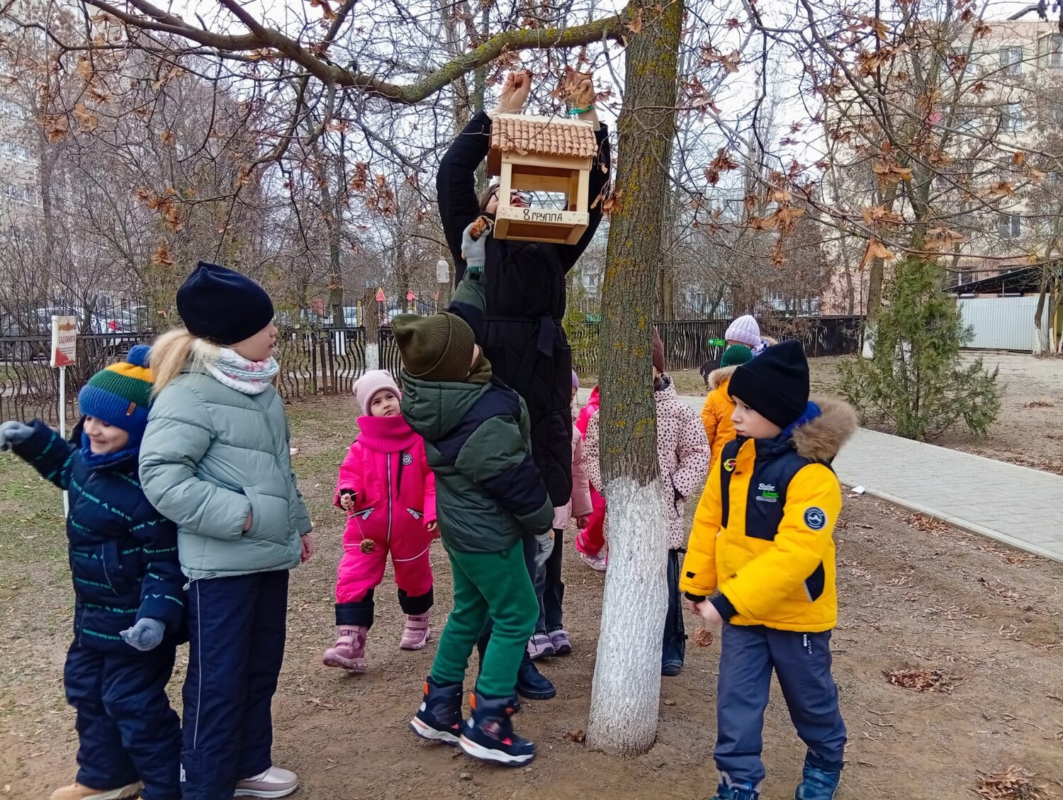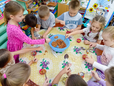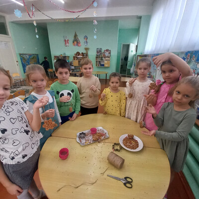 Каждый год воспитанники детского сада активно участвуют в помощи зимующим птицам. В рамках акции «Покормите птиц зимой!» вместе с воспитателем Ниной Сергеевной дети сделали кормушки и угощения для птиц своими руками. На прогулке они развесили их на территории детского сада.